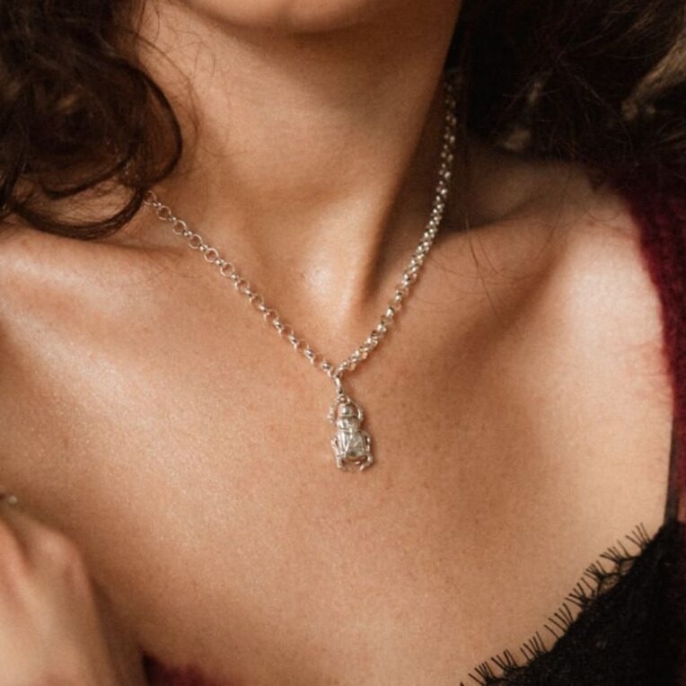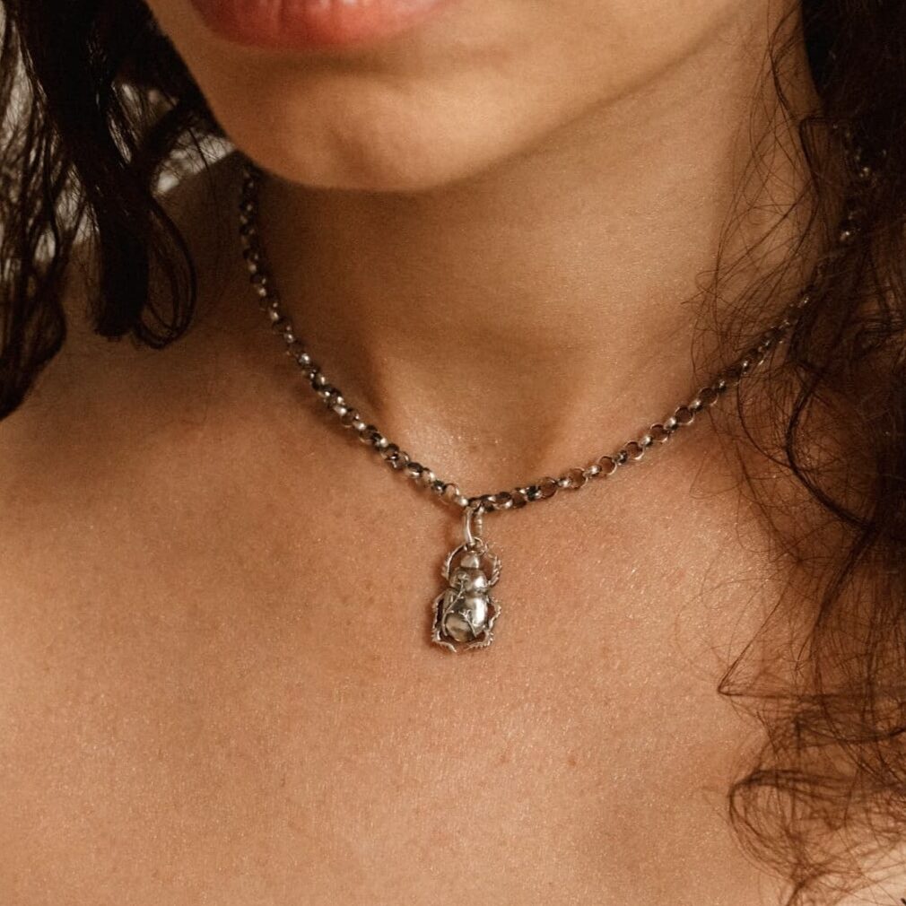 Żuk z kolekcji RUNO to biżuteria o niezwykłej energii – pełna życia i drobnych leśnych tajemnic. Powstał na podstawie autorskiego projektu stworzonego we współpracy z ilustratorką Katarzyną Roman. Na jego pancerzu widać drobne kwiaty charakterystyczne dla kolekcji, a miękkie linie i nieregularna faktura sprawiają, że żuk wygląda jak część natury – małe, żywe stworzenie zaklęte w srebrze.